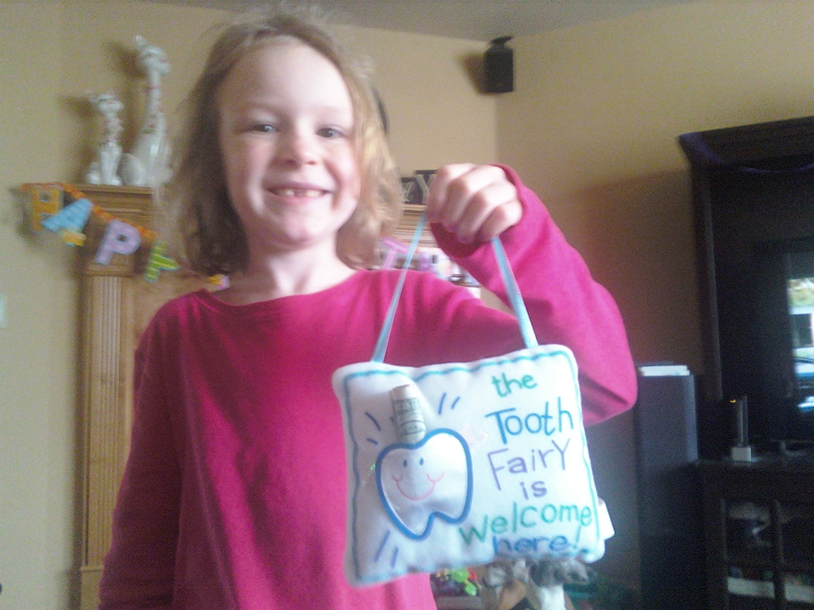 Emma paraded the tooth in hand and her now bigger toothless grin! We got out the tooth pillow for the tooth fairy and left it hanging on the bed. When the sun came up Emma was happy to report that the tooth fairy indeed had visited and left her a dollar!